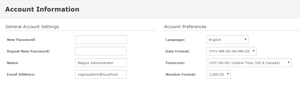 Nagios Fusion allows individual users to manage some of their own account settings and preferences, including: passwords, name, email, language, date and format, timezone, along with automatic logins. In order to gain access to your account settings, simply click on your username in the upper right hand section of the Nagios Fusion window.