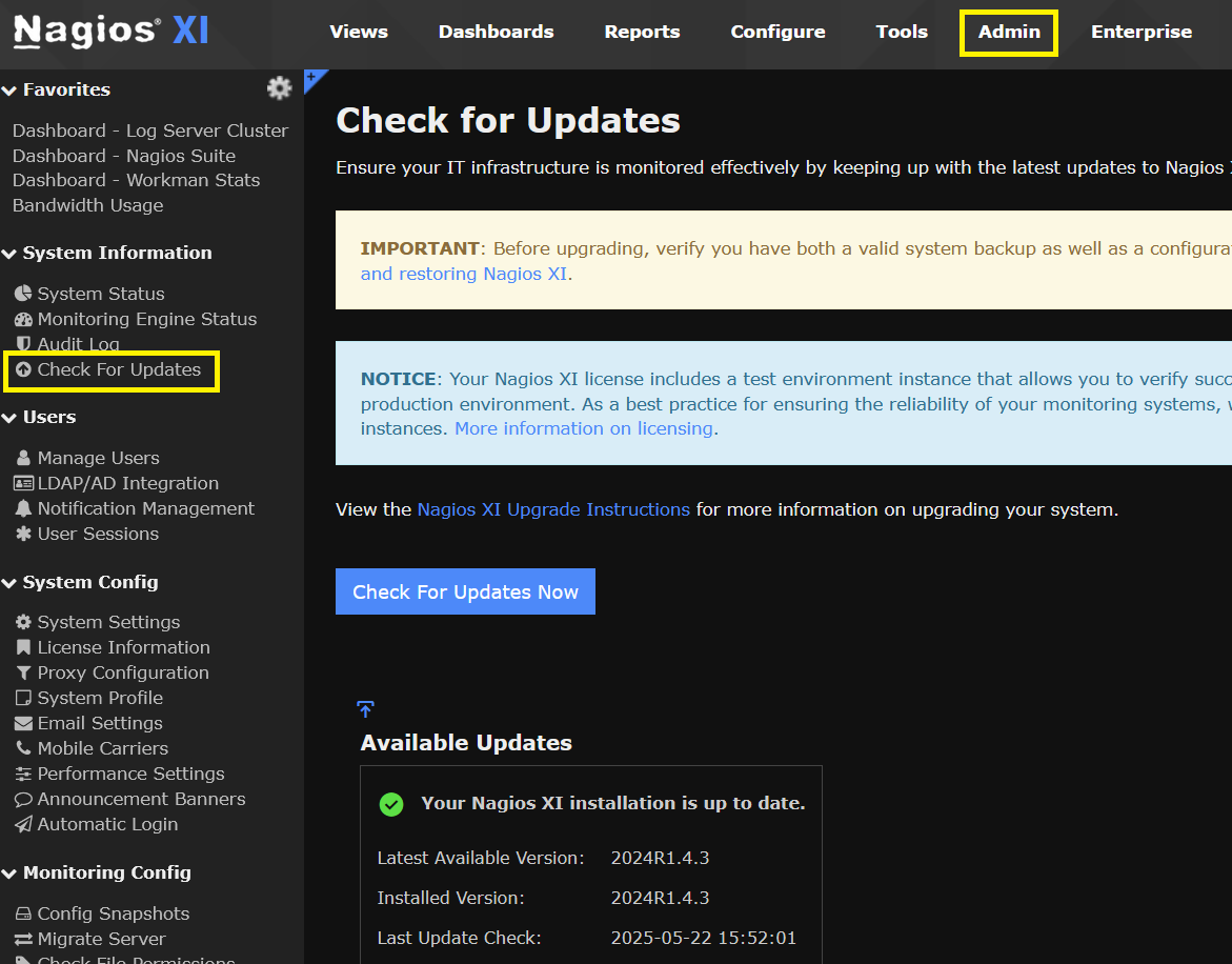 Nagios releases periodic updates for Nagios XI in the form of bug fixes, feature releases, and major version releases. This section goes over the way Nagios XI informs you of an update coming available, and how you can update your Nagios XI system. Nagios XI has the ability to upgrade from almost every previous version. Nagios XI can be upgraded from the GUI and from the command line.
